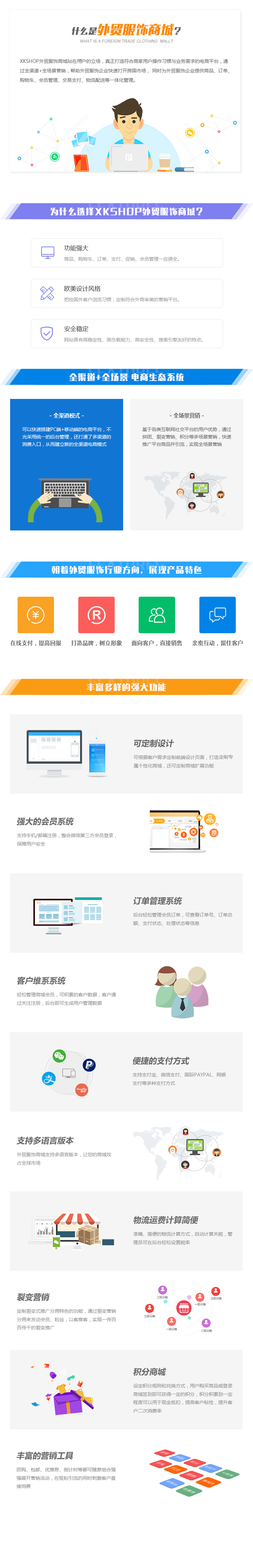 XKSHOP外贸服饰商城站在用户的立场,真正打造符合商家用户操作习惯与业务需求的电商平台,通过全渠道+全场景营销,帮助外贸服饰企业快速打开跨国市场, 同时为外贸服饰企业提供商品、订单、购物车、会员管理、交易支付、物流配送等一体化管理。